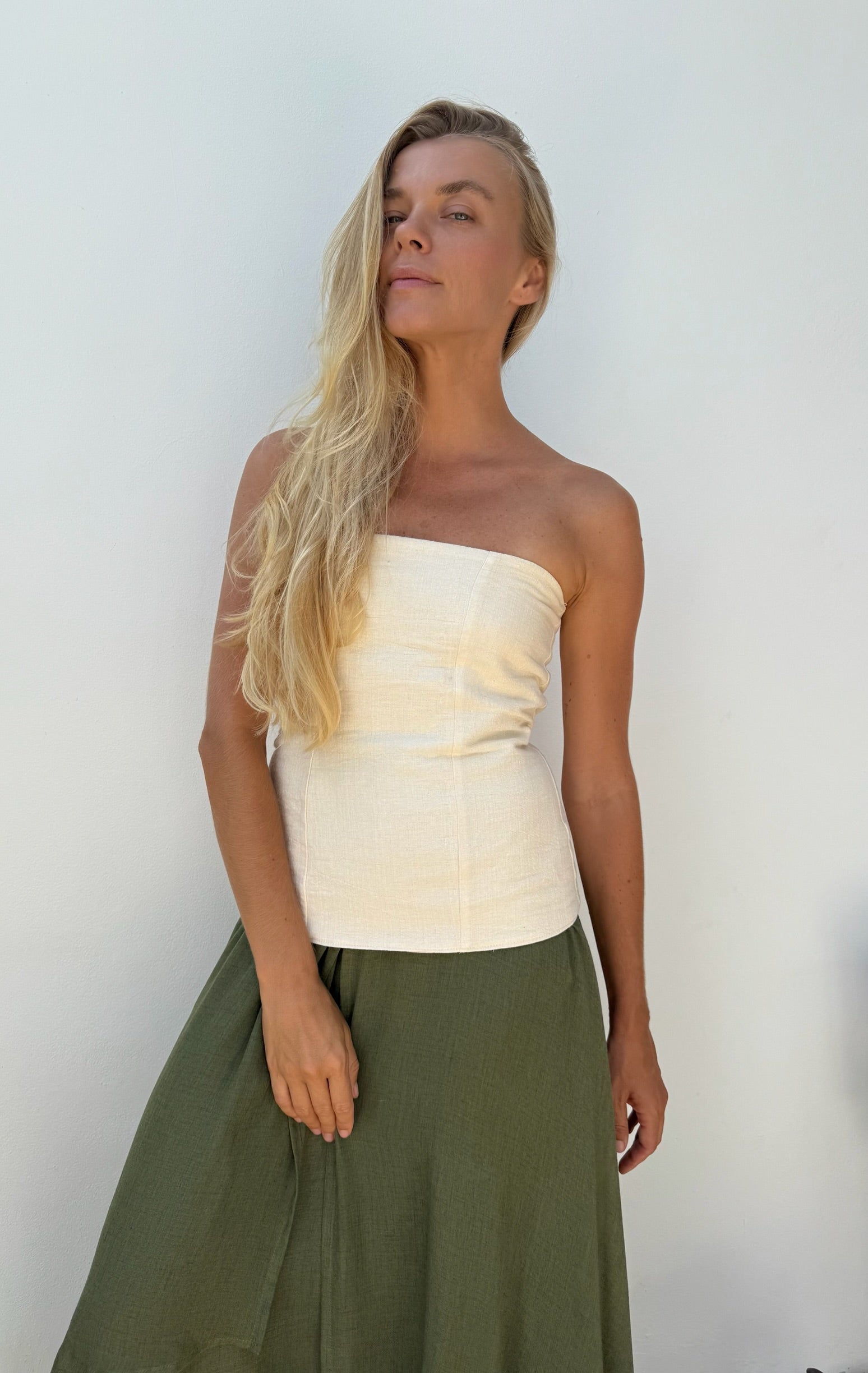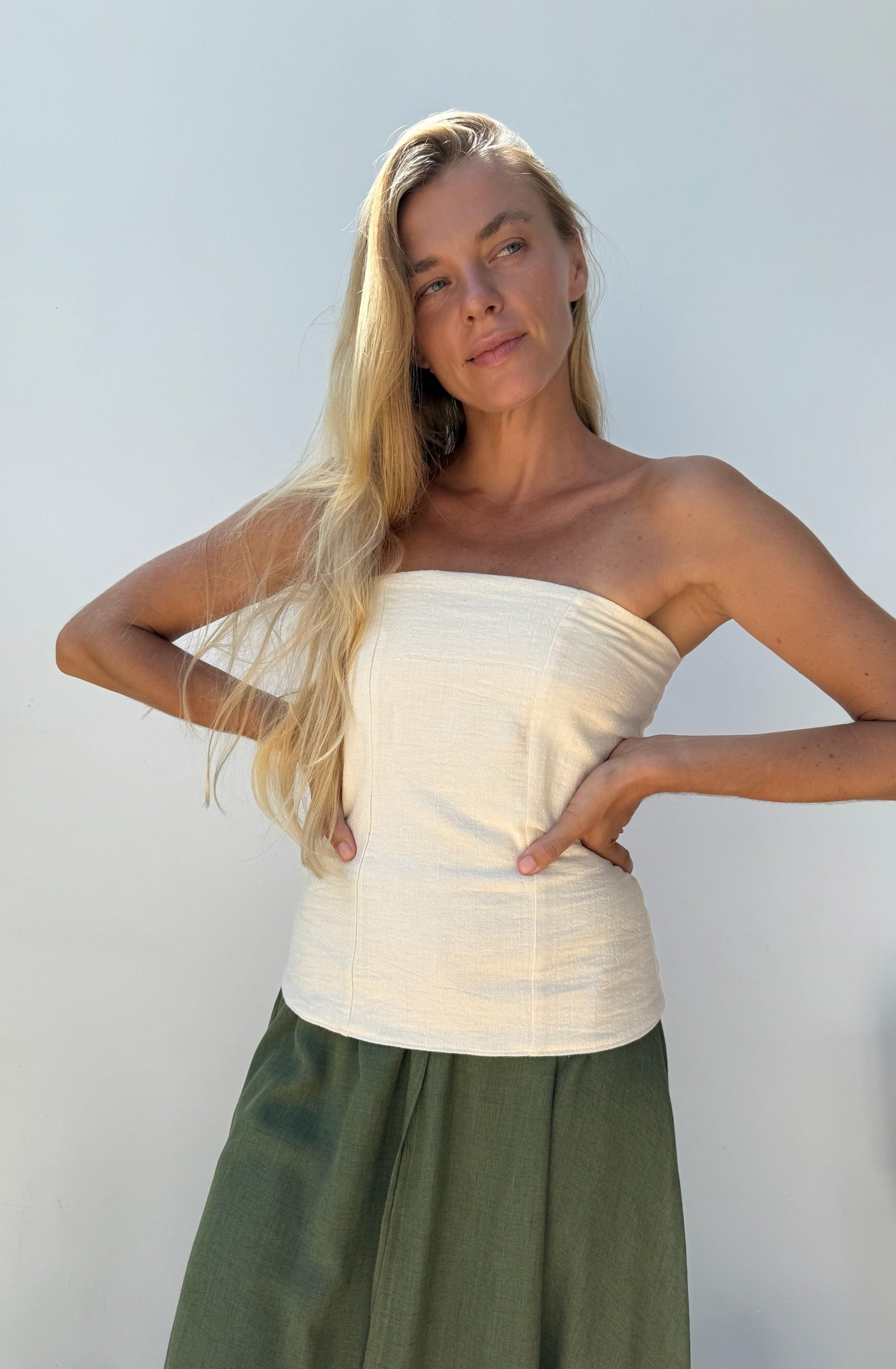 Este top estilo corsé está confeccionado en suave algodón de doble tela, lo que le da mayor cuerpo y firmeza.