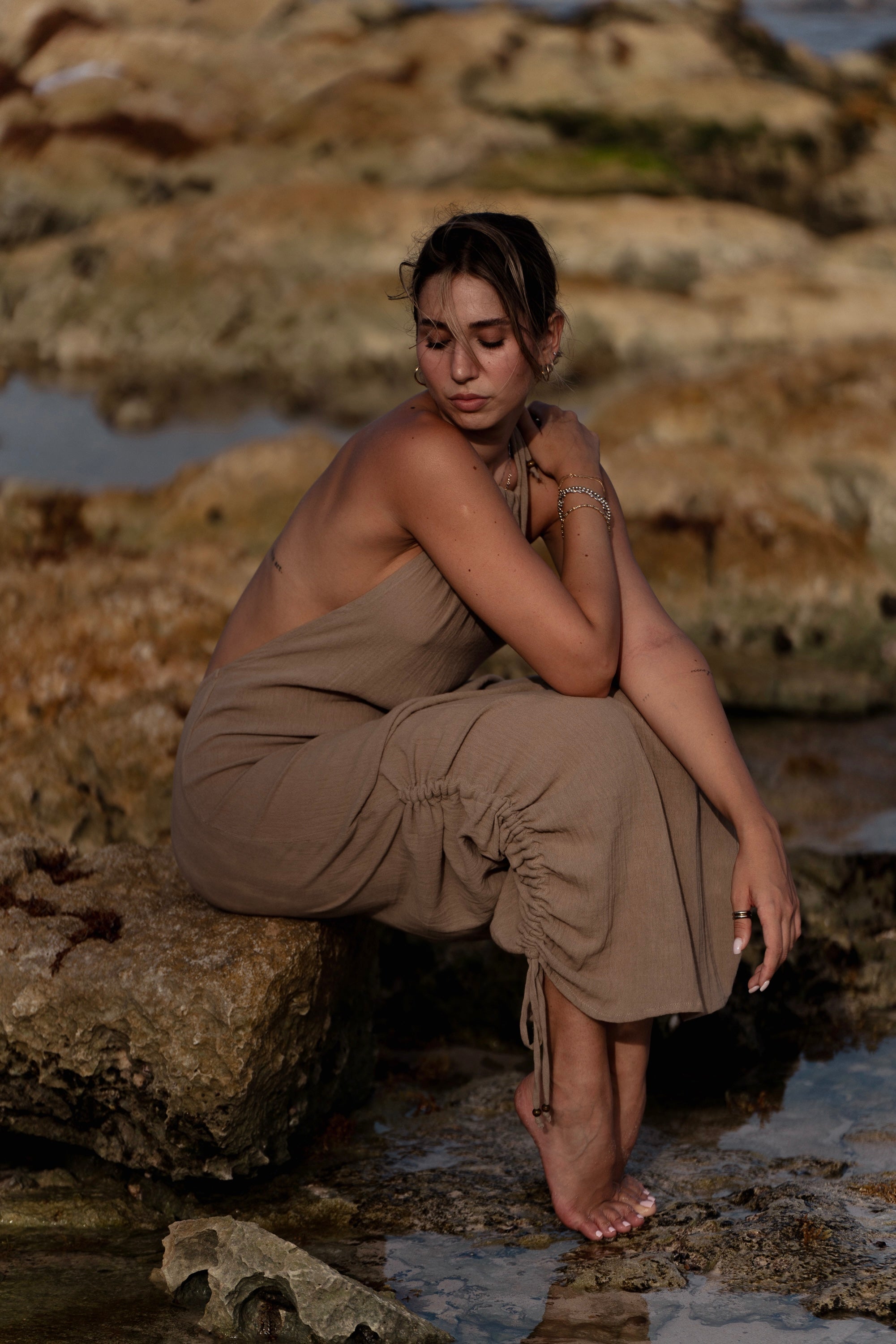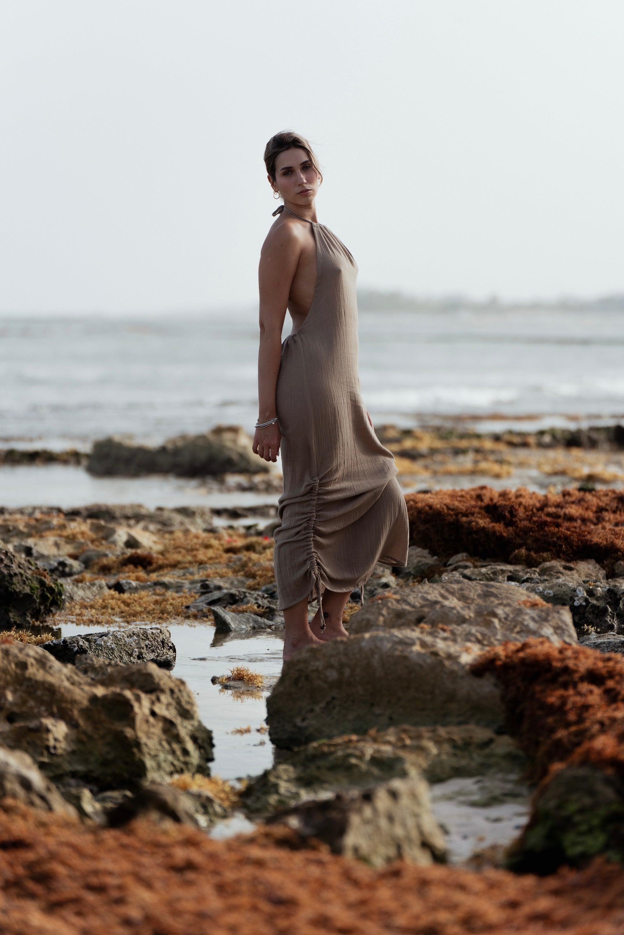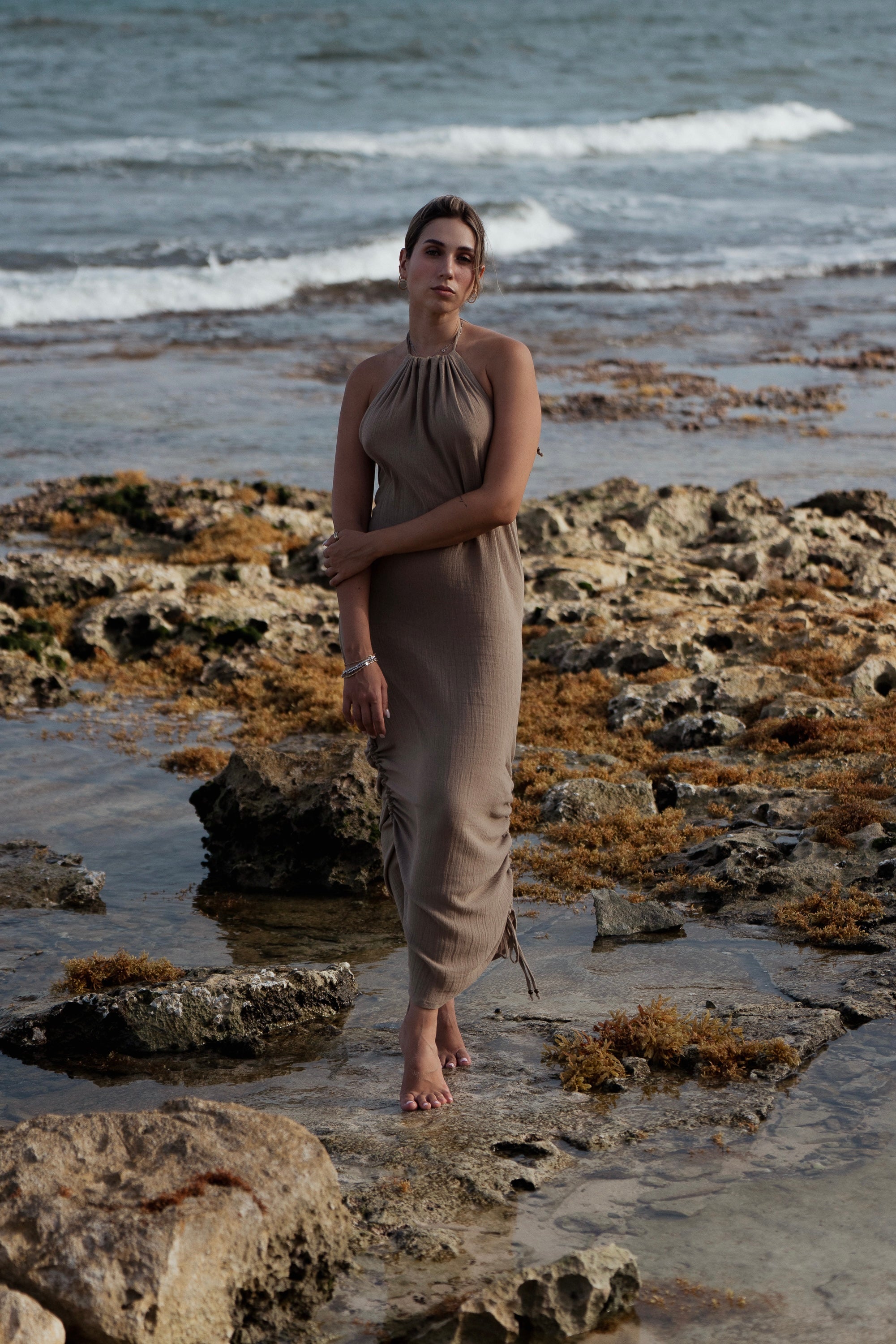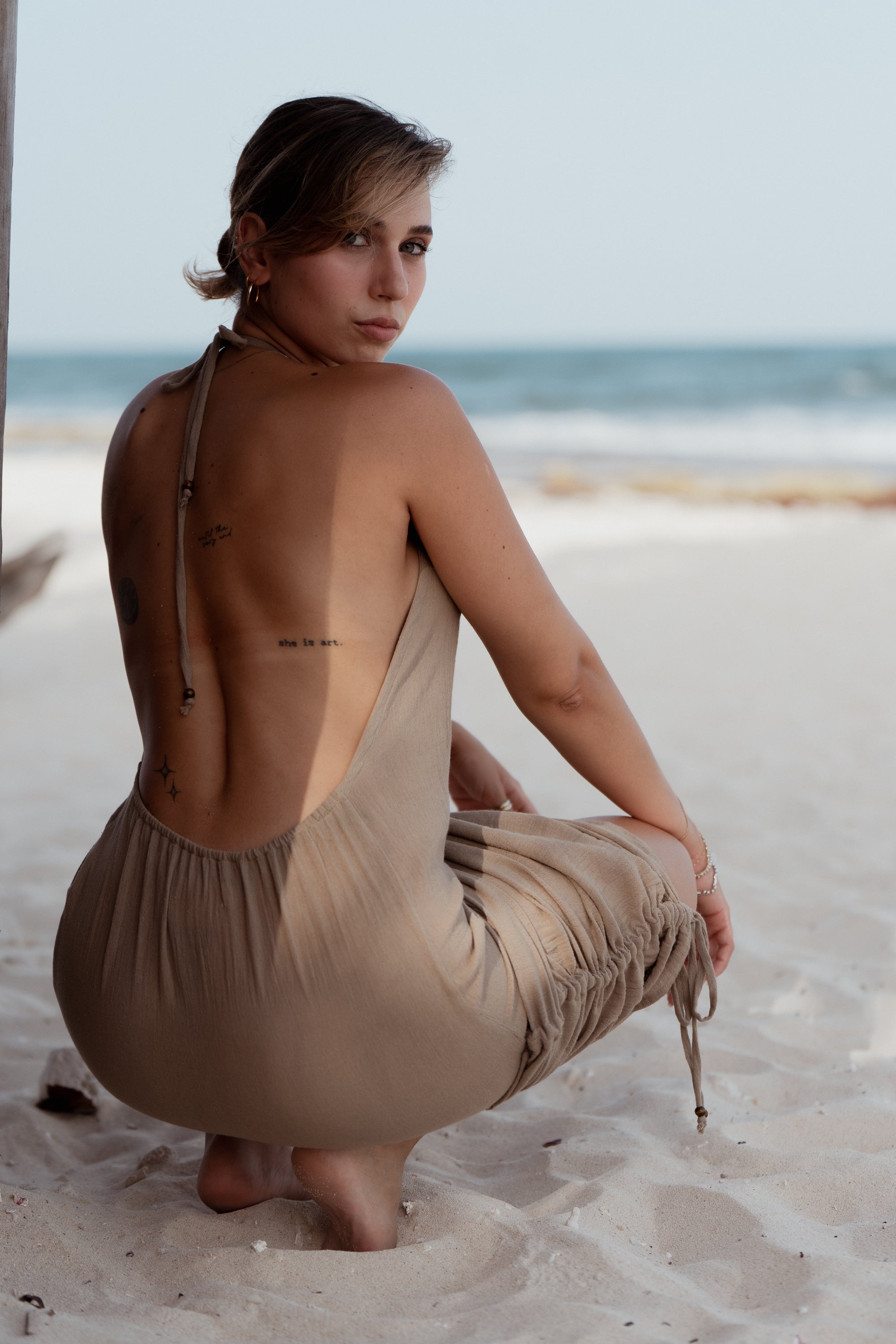 Este vestido es la combinación perfecta de sensualidad y frescura natural. Con espalda descubierta y tiras que se anudan al cuello, ofrece un estilo relajado pero llamativo.
